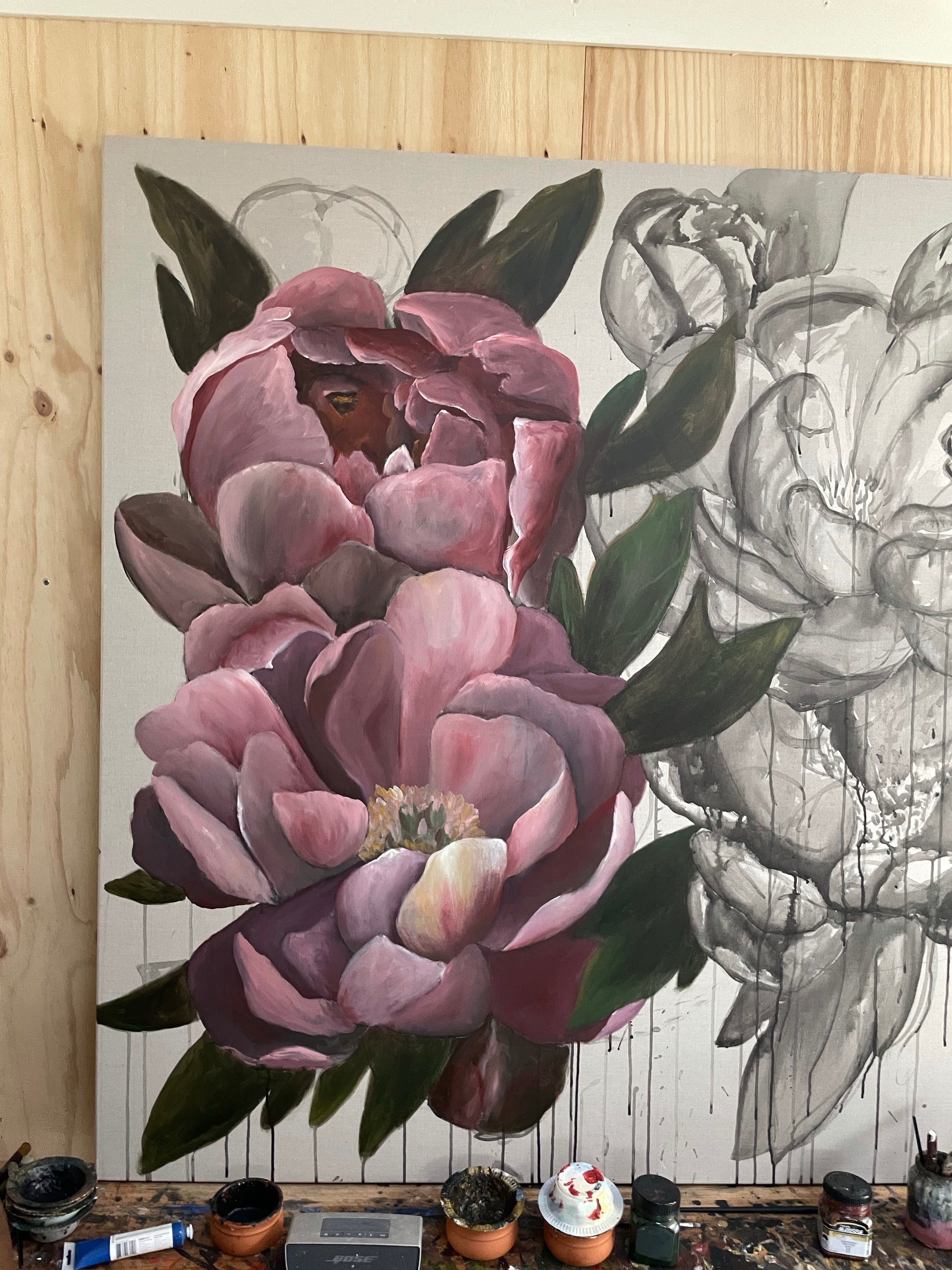 These natural, forming drips evolve, becoming the signature marks that authenticate the individuality of each artwork. As the paint builds and the colors blend, the initial sketches transform into lush, vibrant gardens captured on canvas.